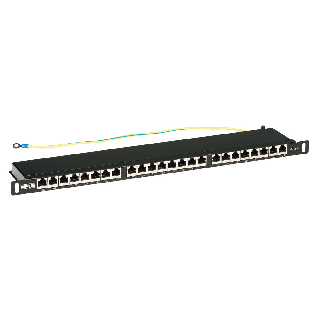 Shielded 24-port patch panel manages and organizes Cat6a input/output cable connections in your high-density Gigabit Ethernet network.